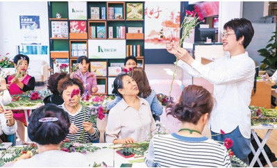 此外,老師還鼓勵學員在課堂之外參與社交互動和公開演出,將課堂所學融入生活之中,從“文化養老”到“老有所為”。滕軍每次上完插花課都會去花市買些花材回家練手,不僅為自己增添生活情趣,還主動為樓道進行花藝布置。“有些訪客一到我們單元就說這里太漂亮了。”她說,能為大家服務的感覺非常好。