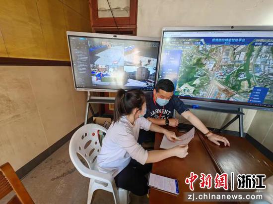 田熊英(女)正在和村黨委委員周立峰商量各個防疫點位的人員安排。 浙江開放大學 提供