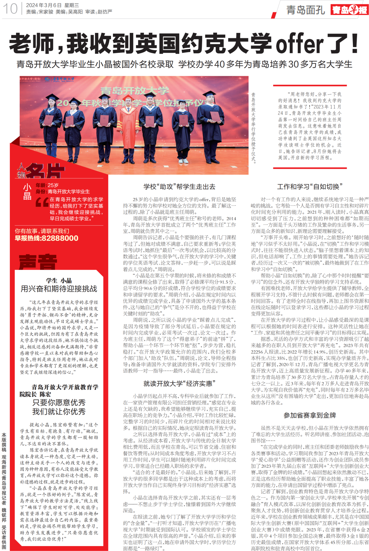 “小晶在青島開放大學的學習經歷,就是一個很好的例子?!标惡暾f,青島開放大學的教學方法靈活,“線上線下”確保了學生時時可學、處處能學;教育資源豐富,學生可以根據興趣和需求選擇最適合自己的內容。最重要的是,學校會竭盡所能幫助學生學習,助力學生發展進步,“只要你愿意優秀,我們就讓你優秀!”