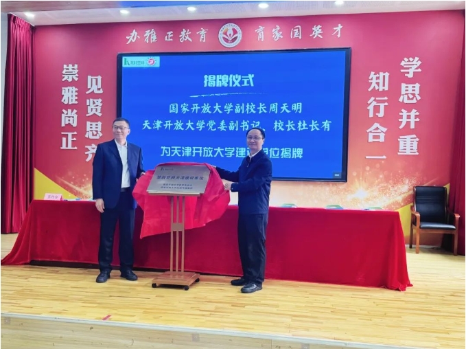 周天明和杜長有共同為“慧齡空間”項目天津合作建設單位(天津開放大學)揭牌。天津市教育委員會繼續教育處副處長王勤,國家開放大學教育基金會秘書長鄭潔,國家開放大學出版傳媒集團董事長馮立國、總編輯劉占榮共同為20個慧齡空間授牌。本次活動標志著“慧齡空間”這一“教育+養老”公益項目正式落地天津。
