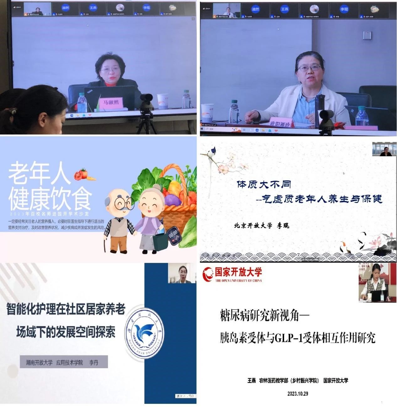 北京開放大學李琨副教授、湖南開放大學李丹博士、國家開放大學王燕博士分別以《體質大不同——氣虛質老年人養生與保健》《智能化護理在社區居家養老場域下的發展空間探索》《糖尿病治療新角度探索:胰島素受體與GLP-1受體的相互作用》為題作了分享交流。