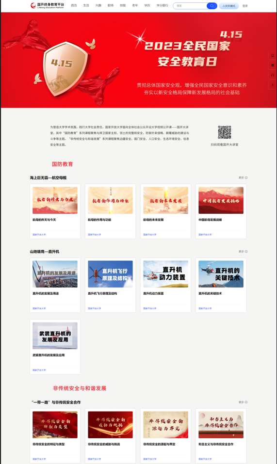 3月28日至5月31日,國(guó)家開放大學(xué)開設(shè)“國(guó)開大講堂?國(guó)家安全教育公開課”系列課程,其中“國(guó)防教育”系列課程聚焦與捍衛(wèi)國(guó)家主權(quán)、領(lǐng)土的完整和安全,防御外來侵略、顛覆威脅的建設(shè)與斗爭(zhēng)等;“非傳統(tǒng)安全與和諧發(fā)展”系列課程聚焦食品安全、人口安全、非傳統(tǒng)安全威脅評(píng)估及其應(yīng)對(duì)、生態(tài)環(huán)境安全、土地安全、金融安全、邊疆安全、國(guó)門安全等,通過學(xué)習(xí)國(guó)家安全教育系列課程,學(xué)生不僅學(xué)習(xí)了相關(guān)安全知識(shí),提高了自身安全防范意識(shí),還增強(qiáng)了國(guó)防意識(shí)和愛國(guó)情感。