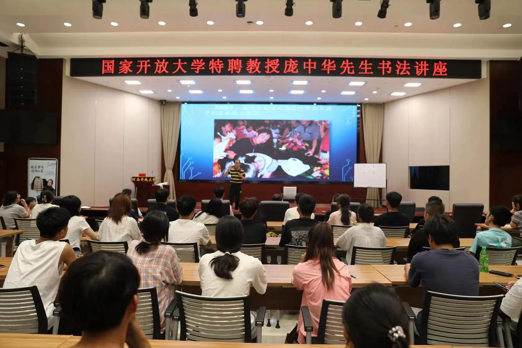 9月4日,國家開放大學藝術學院特聘教授、中國硬筆書法開創者龐中華在河南開放大學舉辦“快樂書寫,浸潤心靈——龐中華先生談書法”專題講座。講座由國家開放大學主辦,河南開放大學承辦。河南開放大學黨委書記趙繼紅、校長孫斌、黨委副書記周海興及100余名師生現場參加講座,全省辦學體系2500余名師生通過線上直播收看講座。
