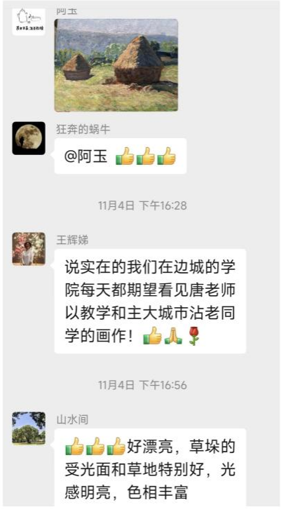 精煉有效的教學(xué)內(nèi)容加上老師們生動(dòng)幽默的表達(dá),使線上線下的學(xué)習(xí)都處于愉快的藝術(shù)氛圍中。線上的學(xué)員即便身處千里之外,也積極參與交流、分享觀點(diǎn)。面授學(xué)習(xí)體驗(yàn)調(diào)查結(jié)果顯示,本期油畫(huà)班的知識(shí)獲得感、學(xué)習(xí)愉快度和總體滿意度獲得了99%的好評(píng)。