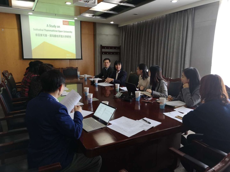 2019年3月13日下午,《世界開放大學案例研究叢書》STOU案例書稿寫作研討會在國家開放大學總部1206會議室召開。出席會議的泰方代表有泰國素可泰·探瑪提叻開放大學(STOU)執(zhí)行副校長Krisana Rungrojwanich教授、執(zhí)行校長助理Bhawat Chiamjinnawat教授、國際事務處處長Rattip Phukkeson,中方代表有研究院院長王迎、副院長李薇、比較所副所長王向旭、研究人員尚磊;出版社綜合事業(yè)部主任劉志君、辛穎,以及來自國開總部國際合作與交流處、財務部、教務部的作者團隊代表。雙方就書稿的寫作和發(fā)行事項開展探討。會議由李薇主持。
