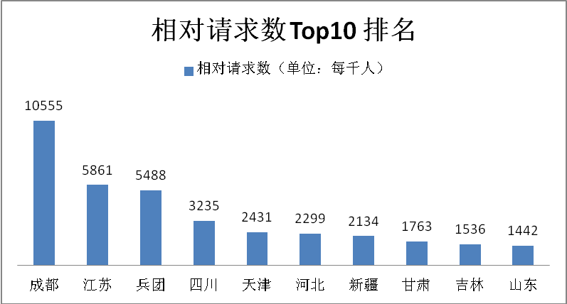 表2顯示了每千人的相對(duì)請(qǐng)求數(shù),排名前5位的地區(qū)為成都、江蘇、兵團(tuán)、四川、天津,成都的相對(duì)請(qǐng)求數(shù)較其他地區(qū)明顯較多。