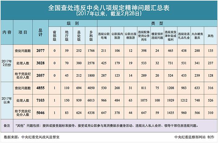 為掌握全國貫徹落實(shí)中央八項(xiàng)規(guī)定精神情況,中央紀(jì)委在31個(gè)省區(qū)市和新疆生產(chǎn)建設(shè)兵團(tuán)、139個(gè)中央和國家機(jī)關(guān)、102個(gè)中央企業(yè)、15個(gè)中央金融企業(yè)建立了落實(shí)中央八項(xiàng)規(guī)定精神情況月報(bào)制度。2017年以來,截至2月28日,全國查處違反中央八項(xiàng)規(guī)定精神問題情況如下: