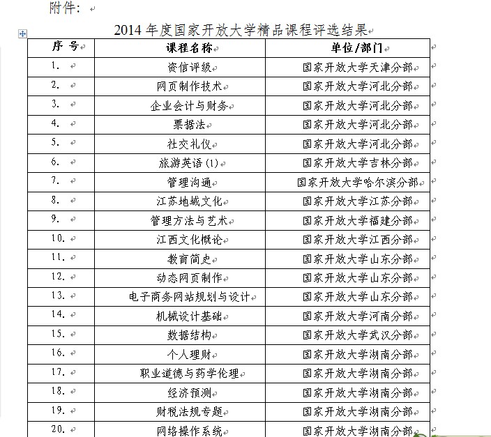 根據《關于申報2014年度國家開放大學精品課程的通知》(國開資源〔2014〕3號)的精神,國家開放大學會同全國廣播電視大學教學資源協作會組織了2014年度國家開放大學精品課程評選活動。經過課程申報、資格審查、網上評審、會議終審等環節,確定33門課程(見附件)為2014年度國家開放大學精品課程,其中國家開放大學各分部入選課程30門,國家開放大學各學科學院入選課程3門,現予以公示。
