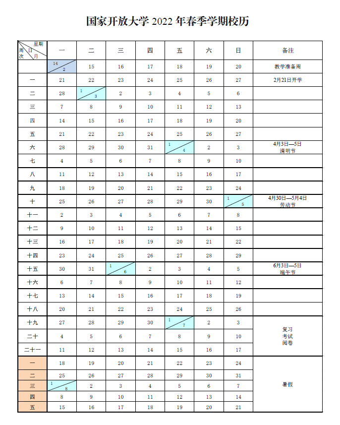 根據(jù)《國務院辦公廳關于2022年部分節(jié)假日安排的通知》(國辦發(fā)明電〔2021〕11號),結(jié)合教學及管理工作實際,經(jīng)研究,制訂了國家開放大學2022年春季學期校歷,現(xiàn)印發(fā)給你們,請據(jù)此安排教學工作。2022年春季學期按18周安排教學,各分部根據(jù)招生情況適當調(diào)整教學安排,期末考試具體時間另行通知。